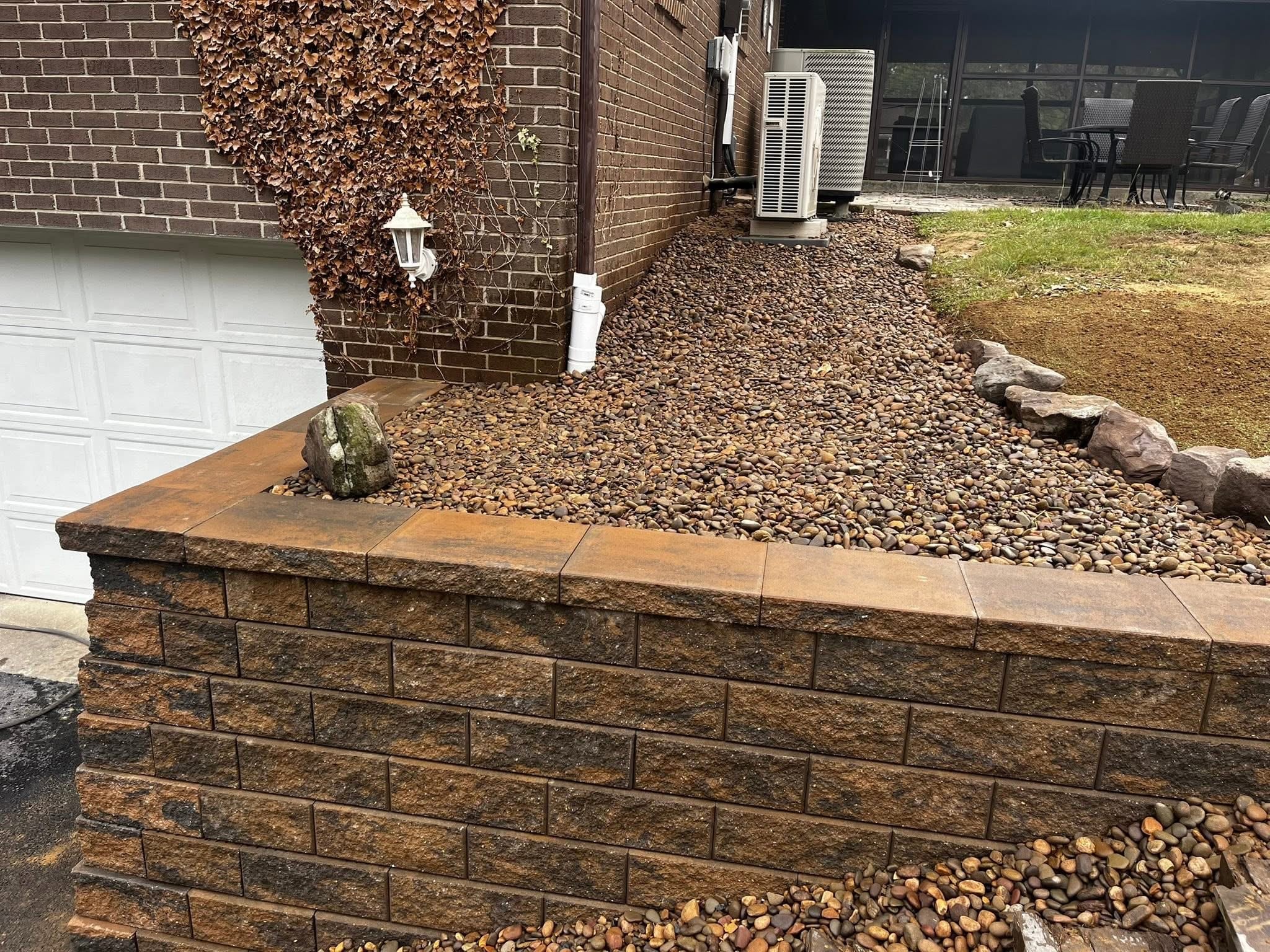 Checkout this transformation completed in Martinsburg WV! We tore out this incorrectly installed retaining wall that had become a hazzard. We came in and installed this retaining wall to last and finished it with Delaware river rock. 🏔️💪🏻
